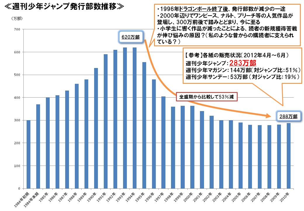 其實,《jump》在1995年開始走下坡路的原因有很多,其中不乏支柱漫畫如《龍珠》完結(jié)、知名漫畫家出走等。但如果大三支柱漫畫的銷量都在下降,這恐怕就不是雜志社本身的問題了。