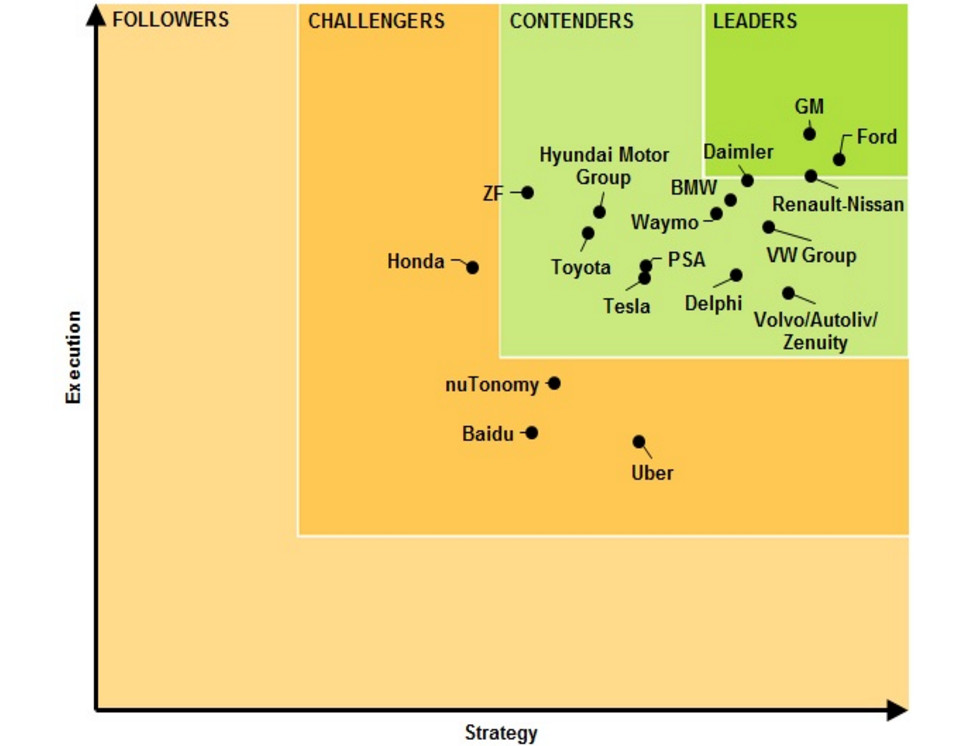 先上干貨,以下是Navigant給出的自動駕駛領域競爭力排行榜: